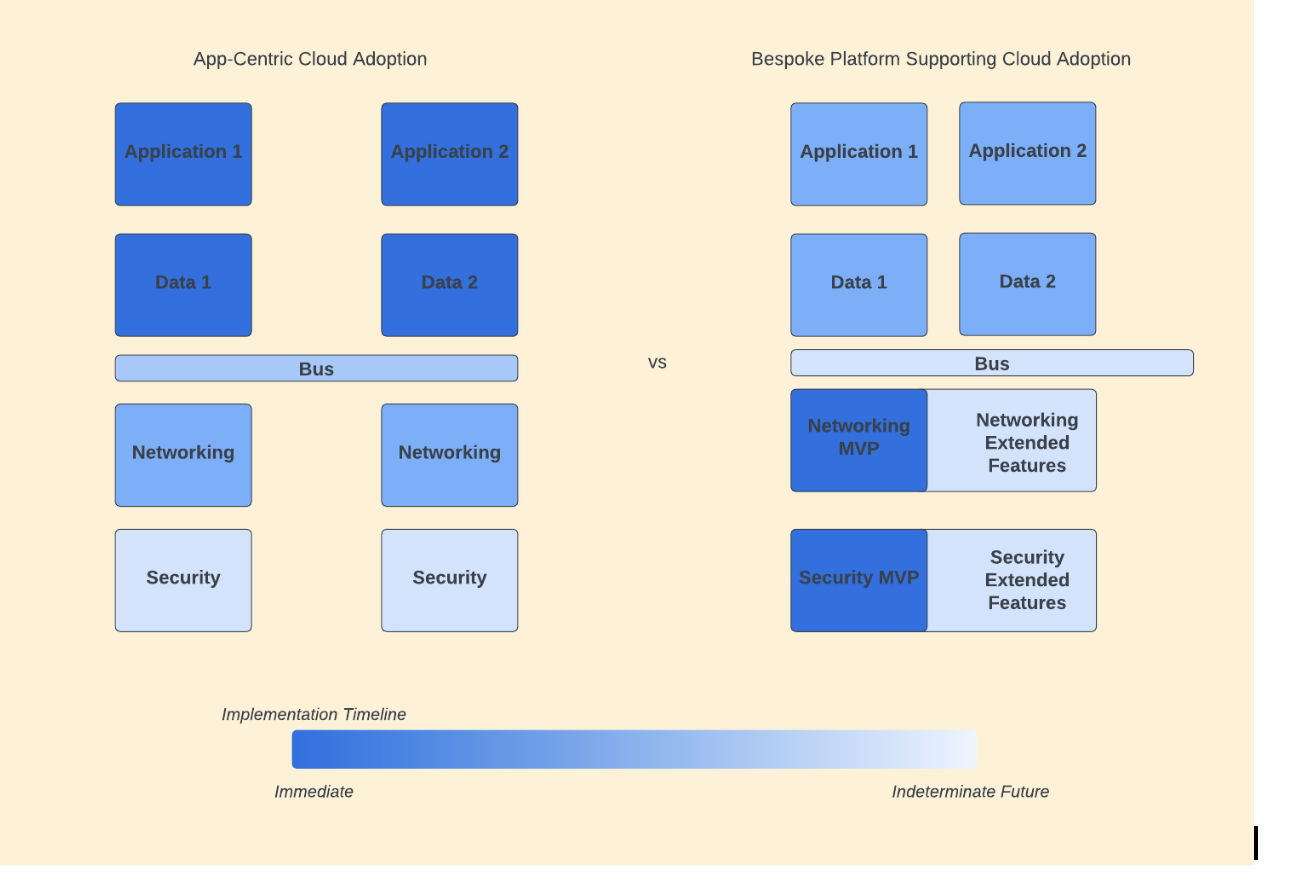 Application-centric cloud adoption often leads to individual application teams engineering the service dependencies, such as access permissions, CI/CD, metrics collection, and high availability as embedded features. This leads to unexpected costs in adopting the cloud. Worse, often, these application-dependent services are engineered on an as-needed basis with fewer engineering resources. This makes the system more difficult to maintain, hence less secure.