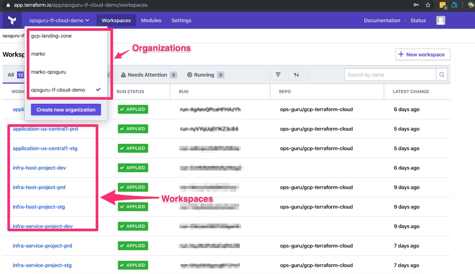 Terraform Cloud uses organizations and workspaces to organize your code and environments. To quote the official documentation, “Organizations are shared spaces for teams to collaborate on infrastructure”. Each organization can have multiple workspaces that define groups of resources of your infrastructure. Normally, a user will create one organization (common use case for small and medium companies) and have multiple workspaces describing your environments. Terraform Cloud documentation provides a really good set of best practices on how to organize and name your workspaces.