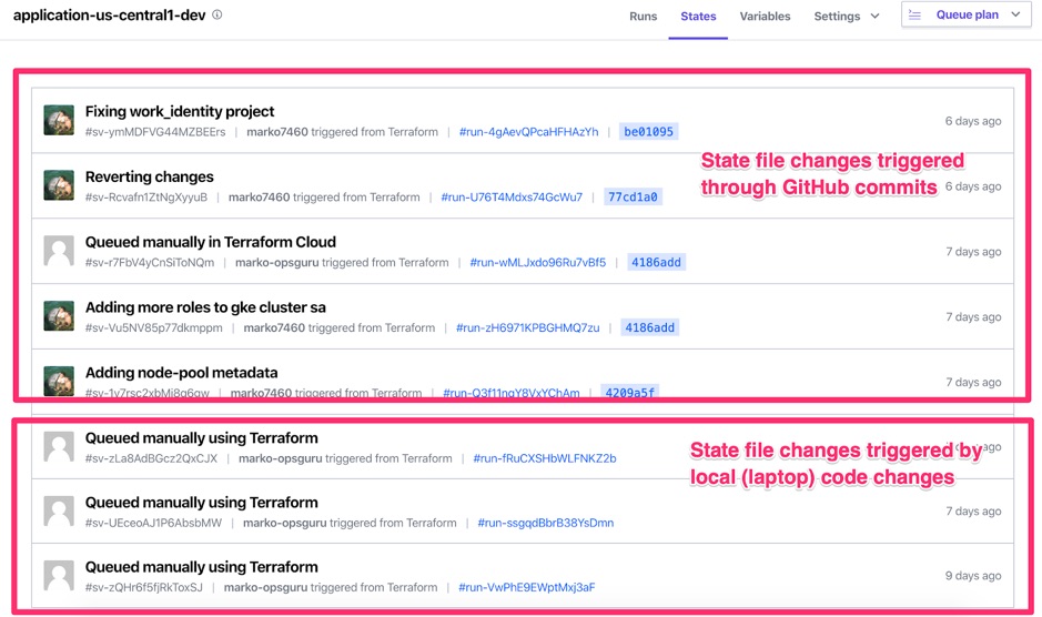 Workspaces eliminate the need for S3, GCS, or any other hosted storage service to store your remote Terraform state files. Terraform Cloud will store state files for you and version it at the same time. You will be able to see a detailed trail of historical changes to the state file which is great for auditing purposes.