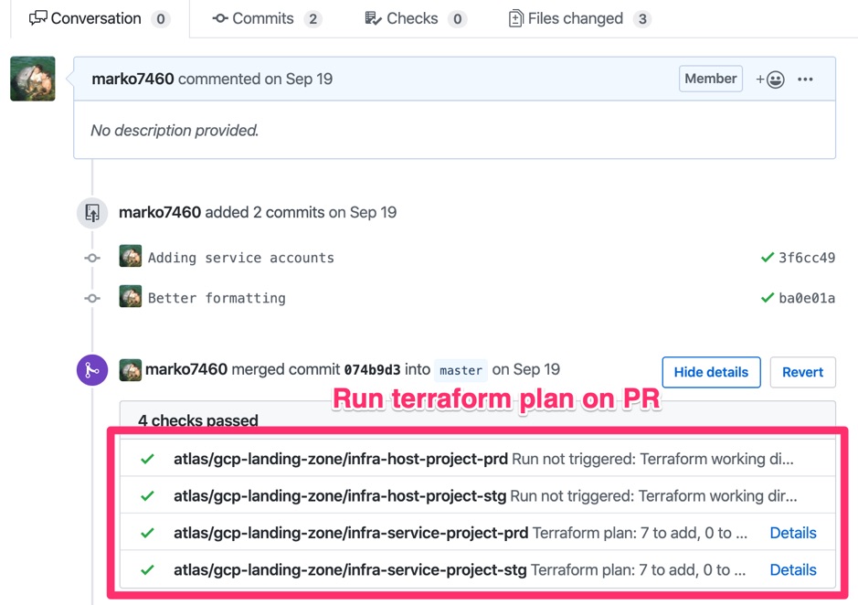 Another cool feature of GitHub integration with Terraform Cloud is automatic run of terraform plan in response to Pull Requests. For example, if your workspace is monitoring master branch and you create a PR on that branch, Terraform Cloud will run terraform plan as part of the PR validation tests. This gives you a small sanity test before doing the PR merge.
