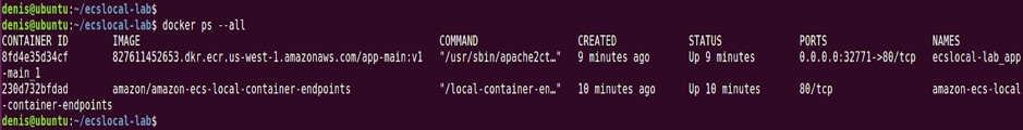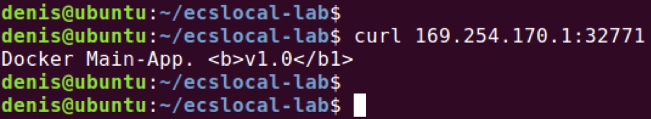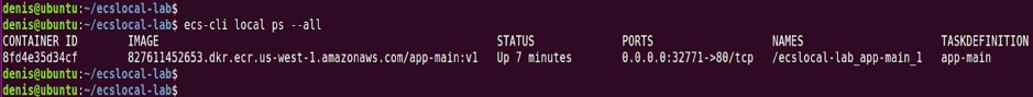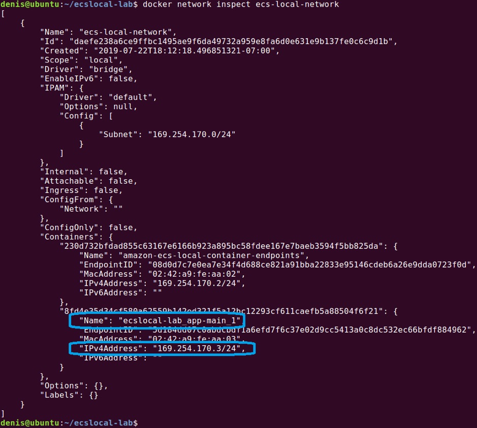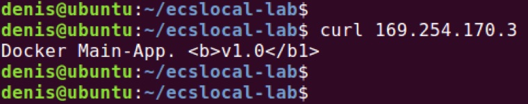 docker-compose.ecs-local.yaml filedocker-compose.ecs-local.override.yml fileecs-local-network for containersamazon/amazon-ecs-local-container-endpointsdocker-compose binary to start the relevant containers as described in our Task Definitionecslocal-lab_app-main_1ECS Local uses the Docker Compose installed on the local machine to create network for containers and provision those containers. The information is captured at the generated docker-compose.ecs-local.yaml file. The ecs-local.yaml file acts as the local counterpart of the task definition that is stored on AWS.