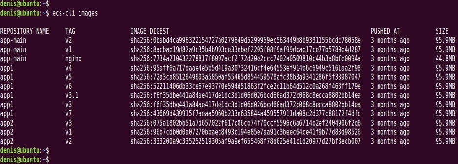 The same images are accessible on the command line with ecs-cli command line tool. For example, the following will list the available images, along with respective metadata.