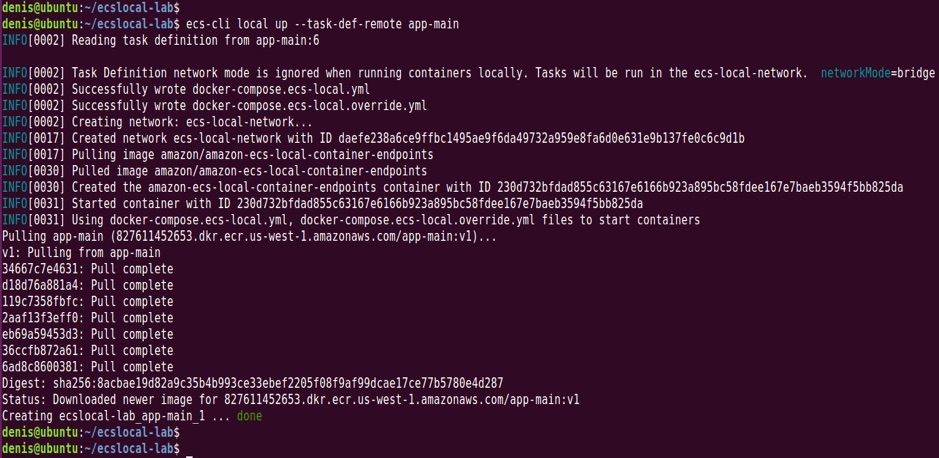 ecs-cli local up --task-def-remote app-main:6app-main is the name of the task-definition and 6 is the revision of the task definition - If the version is omitted, the latest version will be used.