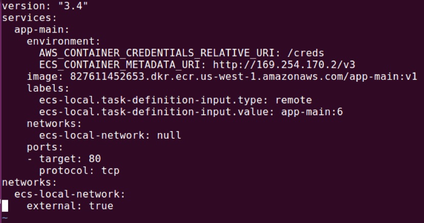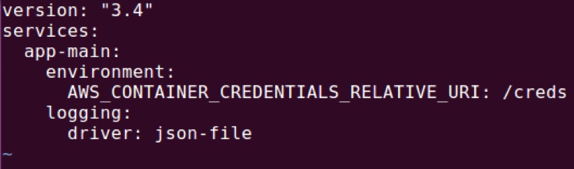 Another file docker-compose.ecs-local.override.yml created is used to define a single container that emulates how credentials are exposed to a running container.